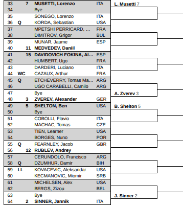 Sinner er også med, som nevnt, men det vet dere nok allerede. To uker på rad for Sinner er ikke alltid ideelt. Han vant i Wien i går etter en tøff finale mot Zverev. Jeg vil si det er en betydelig risiko for at Sinner ikke klarer å yte sitt beste senere i uka. Han har likevel en relativt enkel trekning, der han – som man ser – slipper å møte en seedet spiller i tredje runde etter at Mensik trakk seg sent. Zverev–Medvedev i kvartfinalen kanskje, og vinneren av den kampen mot Sinner i semifinalen.