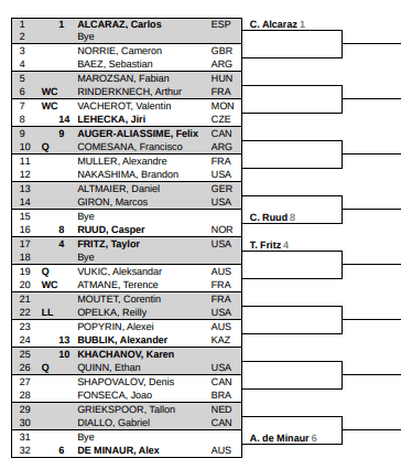 Her er øvre halvdel av trekningen, der Alcaraz naturligvis er toppseedet. Han leder årsrankingen overlegent og kommer til å være verdensener ved sesongslutt. Det spiller liten rolle for Alcaraz hvem han møter nå, men verdt å merke seg er Fritz, De Minaur, Khachanov, Bublik – og kanskje Shapovalov eller til og med Fonseca – som mulige utfordrere. Det er disse som kjemper om retten til å tape for Alcaraz i semifinalen.